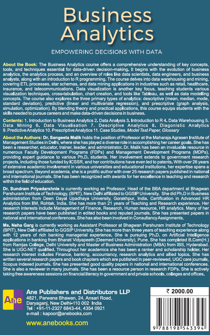 The Business Analytics course offers a comprehensive understanding of key concepts, tools, and techniques essential for data-driven decision-making. It begins with the evolution of business analytics, the analytics process, and an overview of roles like data scientists, data engineers, and business analysts, along with an introduction to R programming. The course delves into data warehousing and mining, covering ETL processes, star schemas, and data mining applications in industries such as retail, healthcare, insurance, and telecommunications. Data visualization is another key focus, teaching students various visualization techniques, cross-tabulation, chart creation, and tools like Tableau, as well as data modelling concepts. The course also explores the three primary types of analytics: descriptive (mean, median, mode, standard deviation), predictive (linear and multivariate regression), and prescriptive (graph analysis, simulation, optimization). By blending theory and practical applications, this course equips students with the skills needed to pursue careers and make data-driven decisions in business.